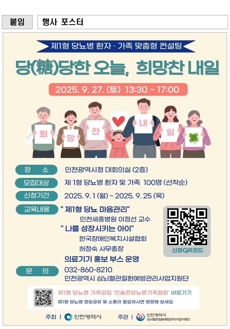 전문 강연에서는 인천세종병원 소아청소년과 이정선 교수가 ‘제1형 당뇨 마음 관리’를 주제로 최신 의료 지식과 생활 관리 요령, 긍정적인 마음 유지 방법, 자기 돌봄 전략을 소개하고 질의응답을 통해 맞춤형 컨설팅을 진행한다. 또한 한국장애인복지시설협회 허정숙 사무총장은 ‘나를 성장시키는 아이’라는 주제로 24시간 돌봄 경험을 바탕으로 한 가족의 성장 사례를 공유한다.