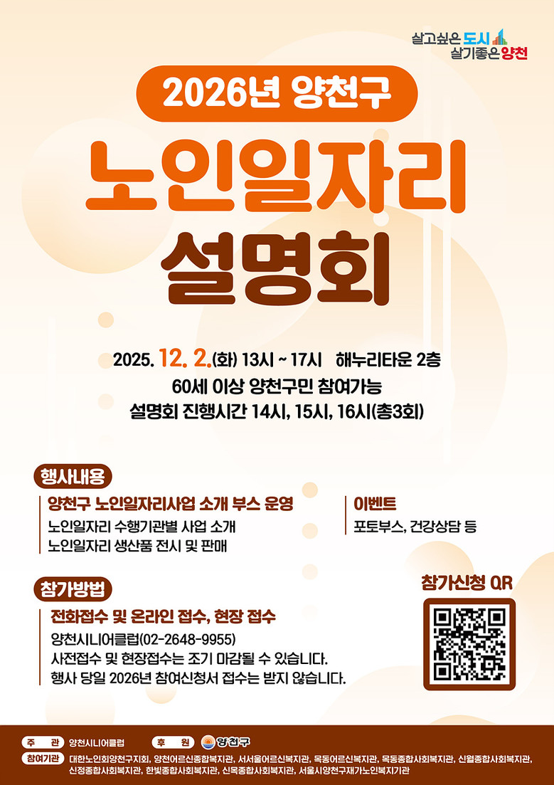 행사 참여를 원하는 어르신은 이달 21일까지 양천시니어클럽 또는 QR코드를 통해 사전 신청할 수 있으며, 행사 당일 현장 접수도 가능하다.
