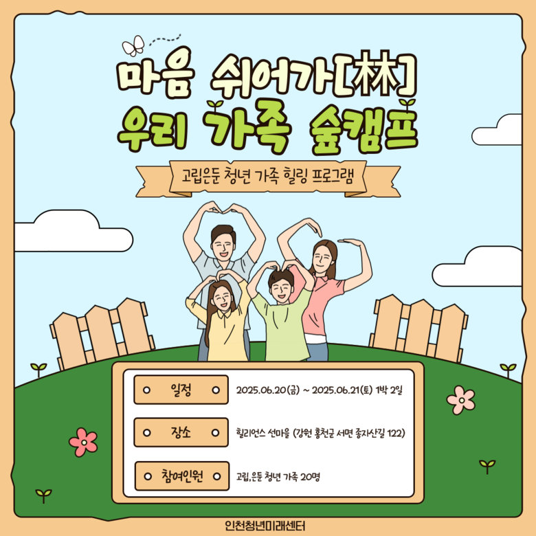 고립은둔청년을 둔 가족 힐링 프로그램도 준비했다. ‘마음 쉬어가(林), 우리가족 숲캠프’는 인천시청년미래센터가 진행한 부모교육과 부모자조모임 등에 참여했던 가족 20명이 강원도로 떠난다. 1박2일 간 숲테라피, 산택, 싱잉볼 명상 등으로 마음을 치유하는 시간이다. 가족과 긍정적인 추억을 공유하고 가족 간 유대감을 높이는 데 집중한다. 비슷한 어려움을 겪는 가족들이 공감대를 이뤄 정서적인 지지 연결망을 만든다.