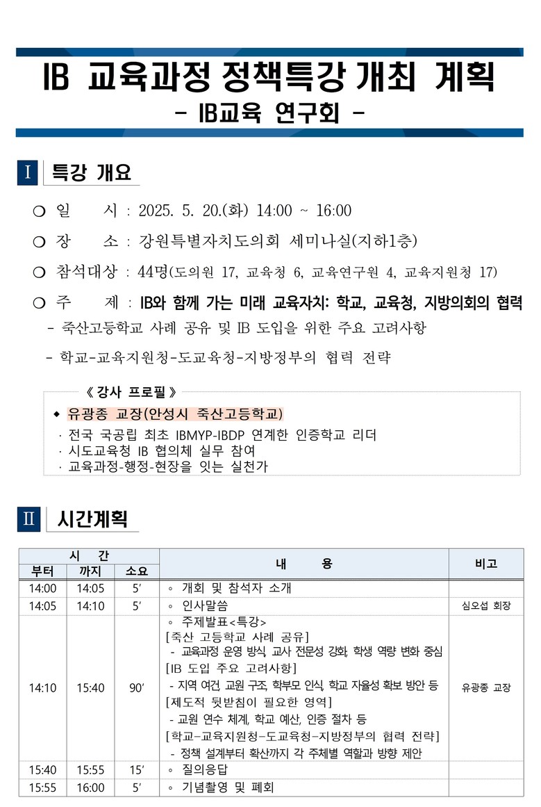 이번 특강은 국공립 최초 IB 인증 연계학교(IBMYP–IBDP)인 안성시 죽산고등학교의 유광종 교장을 초청하여 진행되며, 지역 내 IB 교육과정 도입 가능성과 학교 자율성 강화 및 교육자치 실현을 위한 정책 과제와 협력 전략을 중심으로 강의가 이루어질 예정이다.