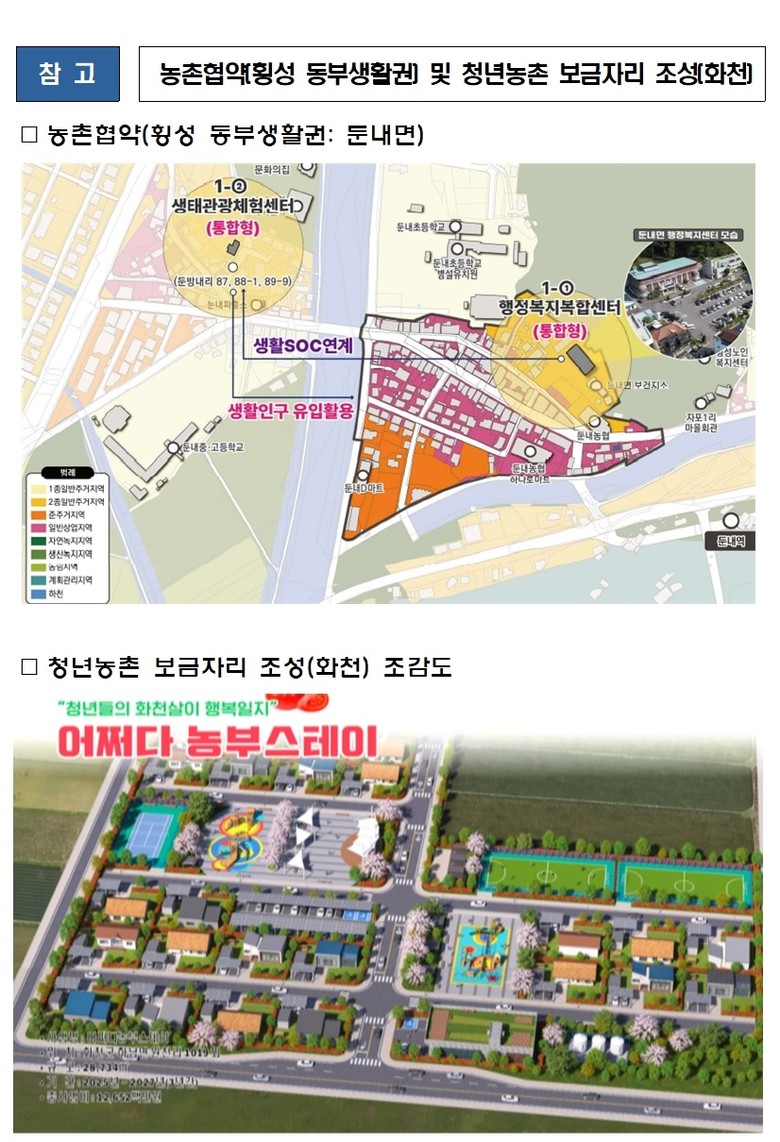 도(道)에서는 횡성군 동부생활권인 안흥면, 둔내면, 청일면, 강일면 대상 5년간 총사업비 455억 원을 신청하여 문화‧복지‧체육시설 등을 조성해 지역 주민들의 삶의 질과 정주 여건을 한 층 더 개선할 계획이다.