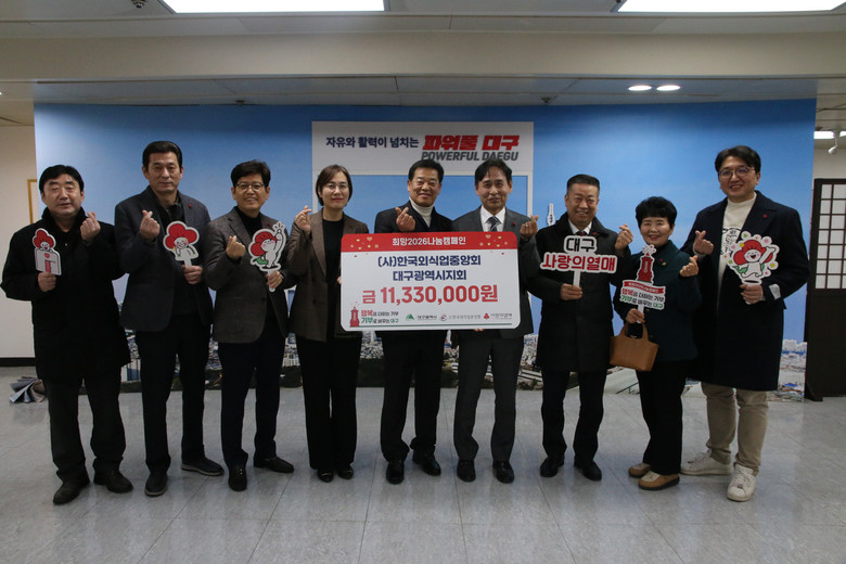 [대구 세계타임즈=한윤석 기자] (사)한국외식업중앙회 대구광역시지회(지회장 박오규)는 ‘따뜻한 새해맞이’ 나눔 활동의 일환으로 대구사회복지공동모금회에 이웃돕기 성금 1,133만 원을 전달했다.