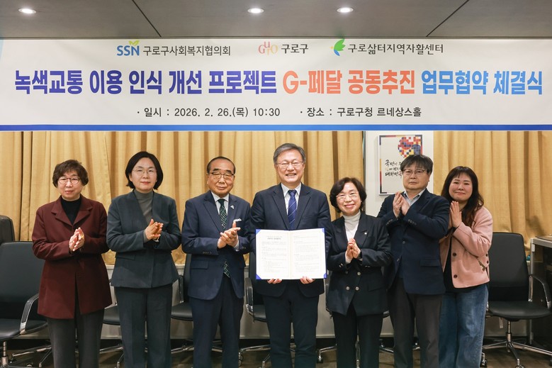 구는 2월 26일 구청 르네상스홀에서 구로구사회복지협의회, 서울구로삶터지역자활센터와 ‘지(G)-페달’ 공동 추진 업무협약을 체결하고 기관 간 협력체계를 구축했다.