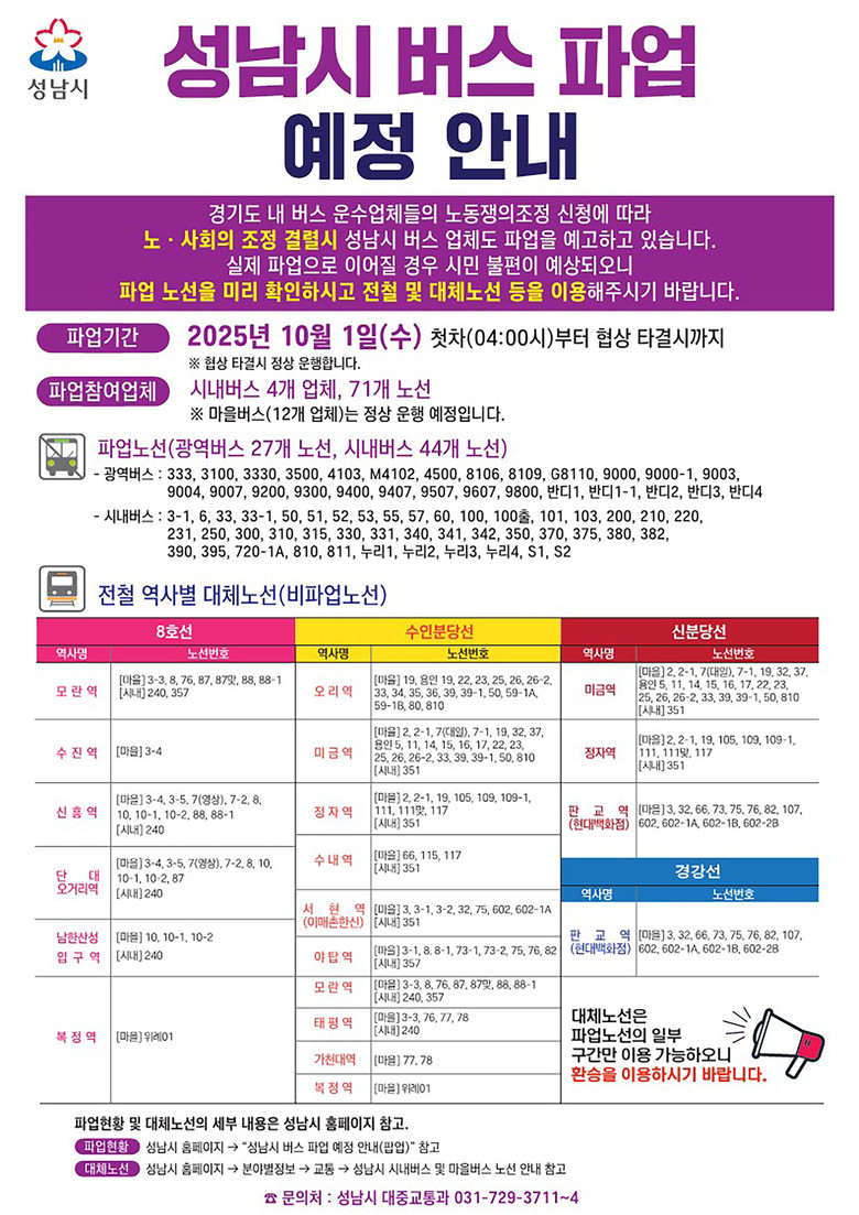 성남시는 파업으로 인한 시민 불편을 최소화하기 위해 버스정류장에 안내문을 부착하고, 지하철역 인근 28개소에 안내 현수막을 설치했다. 또한 버스정보시스템(BIS) 안내 메시지 송출, 시 홈페이지 게시, 재난문자 발송 등 다양한 홍보 매체를 활용해 대체 노선을 적극 안내하고 있다.