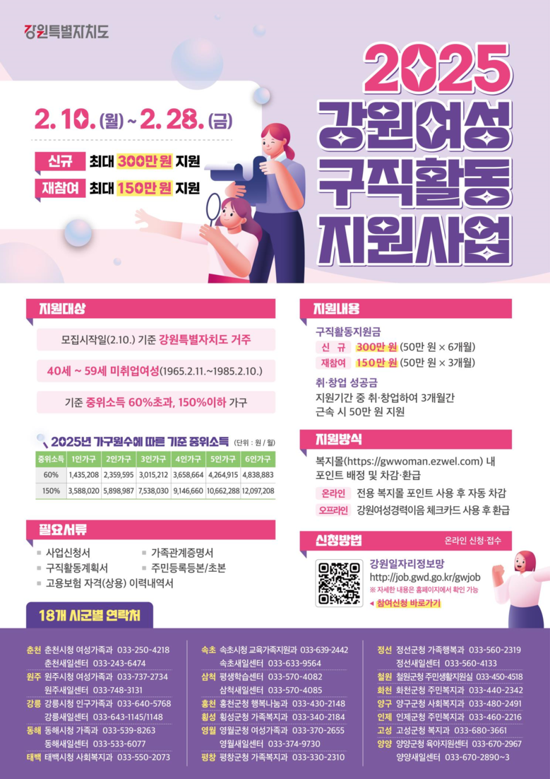 ✔재참여 250명 월 50만 원×3개월 최대 150만 원 지원! [강원도 세계타임즈=김민석 기자] 강원특별자치도(도지사 김진태, 이하 ‘도’)는 2월 10일부터 도내 경력단절 미취업 여성의 경제활동 참여를 돕기 위한 「여성구직활동 지원사업」 대상자를 모집한다.