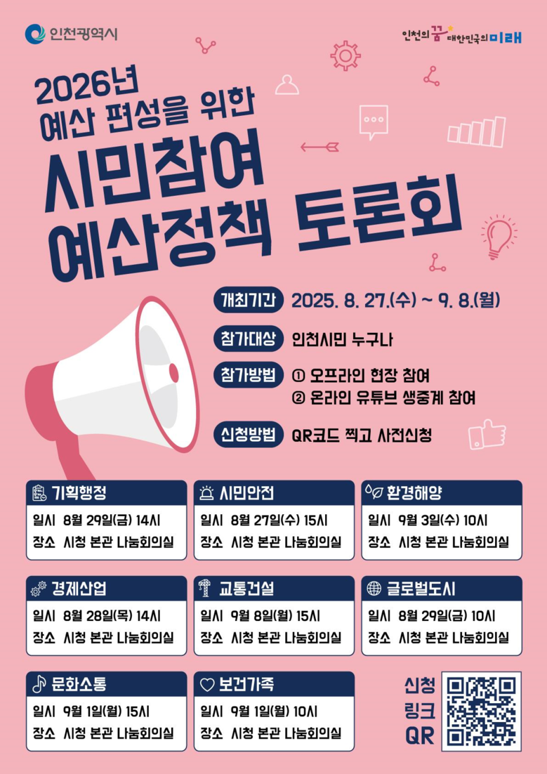 시민들의 참여 확대를 위해 대면 토론과 함께 온라인(유튜브) 생중계도 병행된다. 참여를 원하는 시민은 인천시 주민참여예산 누리집에서 신청하거나 정보무늬(QR코드)를 통해 접수하면 된다. 온라인 참여자의 경우, 토론회 당일 접속 링크가 개별 발송된다.