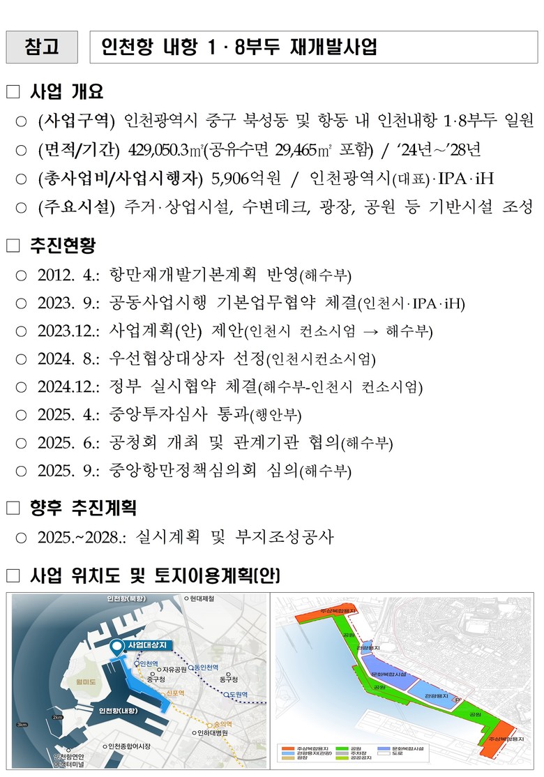인천시는 2007년 시민 청원으로 시작된 내항 1‧8부두 재개발사업이 약 18년의 지연 끝에 본격 추진되었으며, 이번 사업은 전국 최초로 지방정부가 직접 사업시행자로 참여한 항만 재개발사업으로서 약 18개월 만에 타당성조사, 정부 실시협약 체결, 중앙투자심사 통과, 사업계획 확정 등 주요 절차를 신속히 완료했다.
