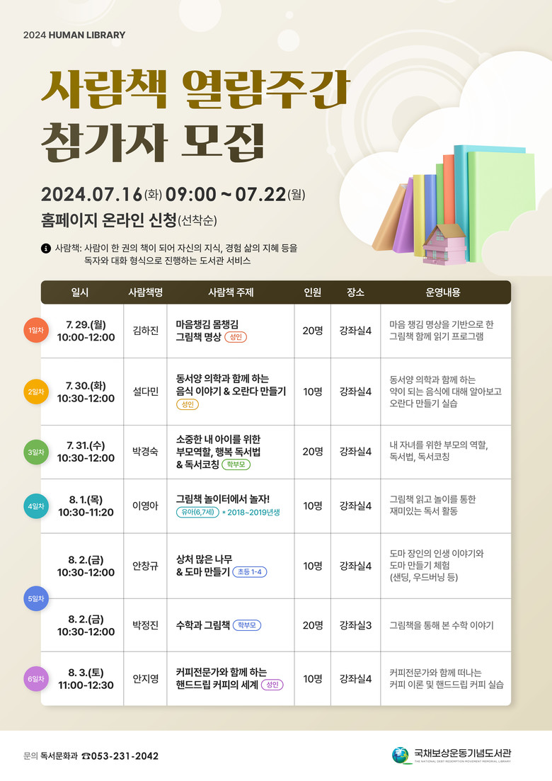 참가 신청은 7월 16일(화) 오전 9시부터 도서관 누리집(library.daegu.go.kr/gukbo)을 통해 선착순으로 진행된다. 자세한 내용은 도서관 누리집을 참고하거나 독서문화과(☎231-2042)로 문의하면 된다.