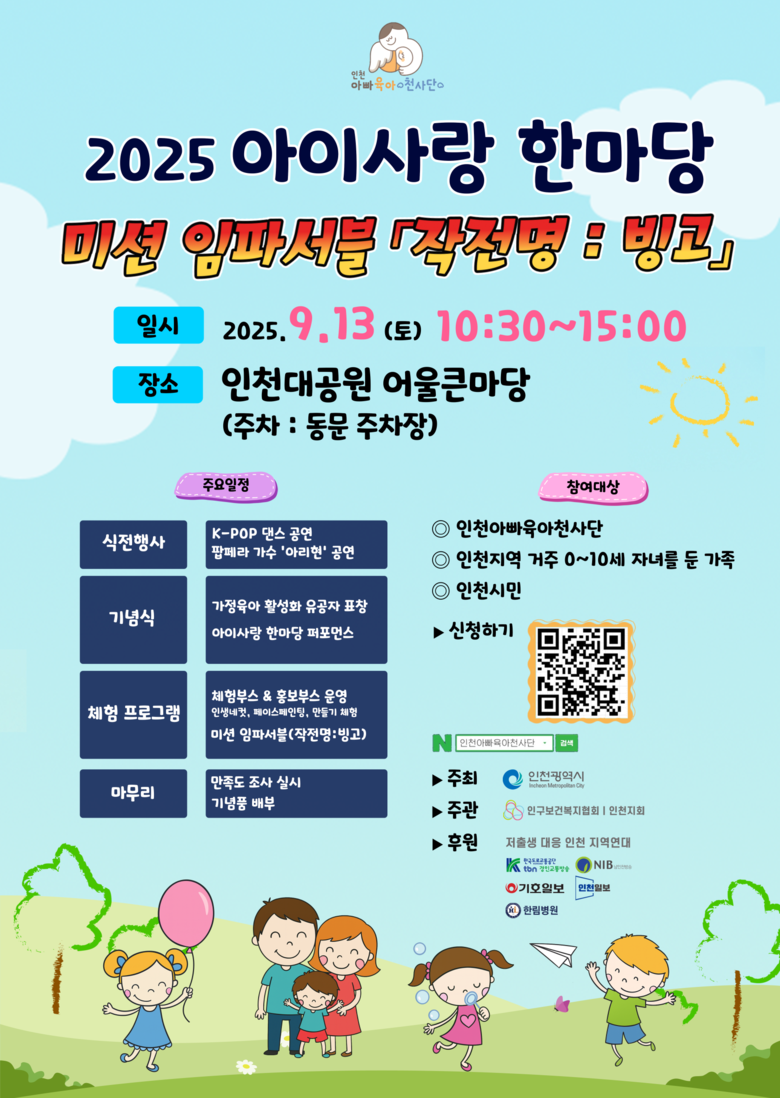 이번 행사는 육아의 즐거움을 함께 나누고 가족의 소중한 의미를 되새기기 위해 마련됐다. 인천아빠육아천사단을 비롯해 인천 지역에 거주하는 0~10세 자녀를 둔 가족이라면 누구나 참여할 수 있다.