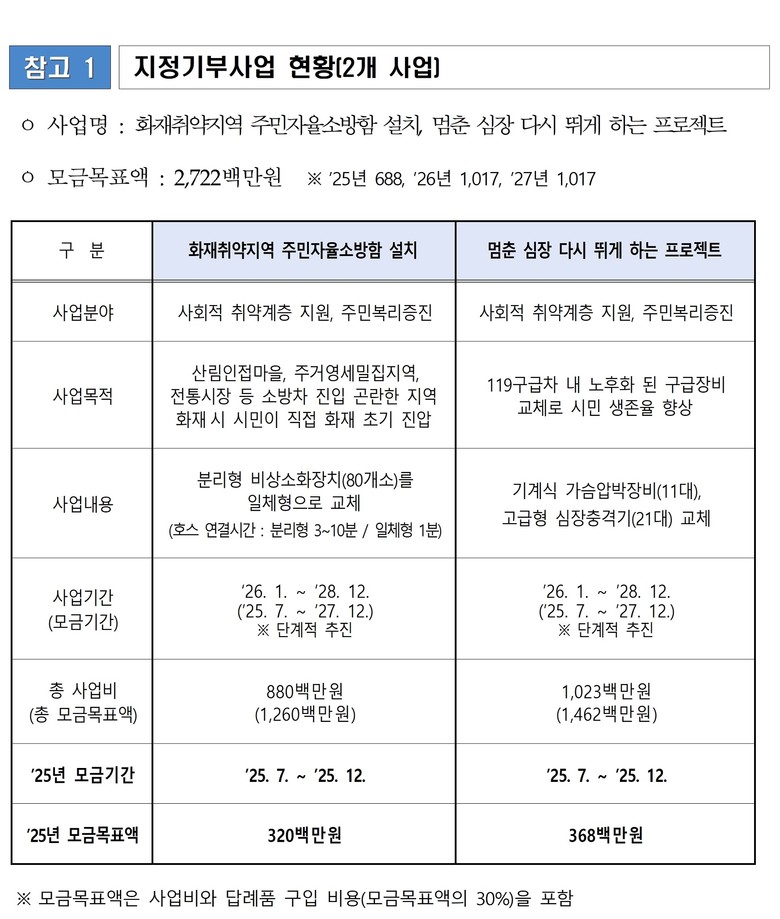 이번 모금의 목표액은 27억 2천2백만 원이며 모금 기간은 올해(2025년) 7월부터 2027년 12월까지 2년 6개월, 사업 기간은 내년(2026년) 1월부터 2028년 12월까지 3년이다. 올해 모금목표액은 6억 8천8백만 원으로 모금이 완료되면 사업 추진에 활용된다.