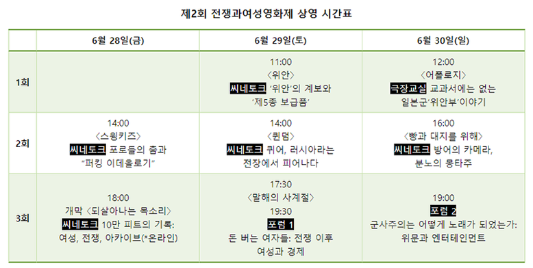 전쟁과여성영화제는 영화 상영 못지않게 대담을 통해 영화에 대한 생각을 나누는 것을 중요하게 여긴다. 개막작인 〈되살아나는 목소리〉 상영 후 진행되는 씨네토크 ‘10만 피트의 기록: 여성, 전쟁, 아카이브’와 〈위안〉 상영 후 진행되는 ‘‘위안’의 계보와 ‘제5종 보급품’’은 각각의 영화를 만든 박수남·박마의 감독과 이혜린 감독이 영화에 대한 더 깊은 이야기를 전할 예정이다.