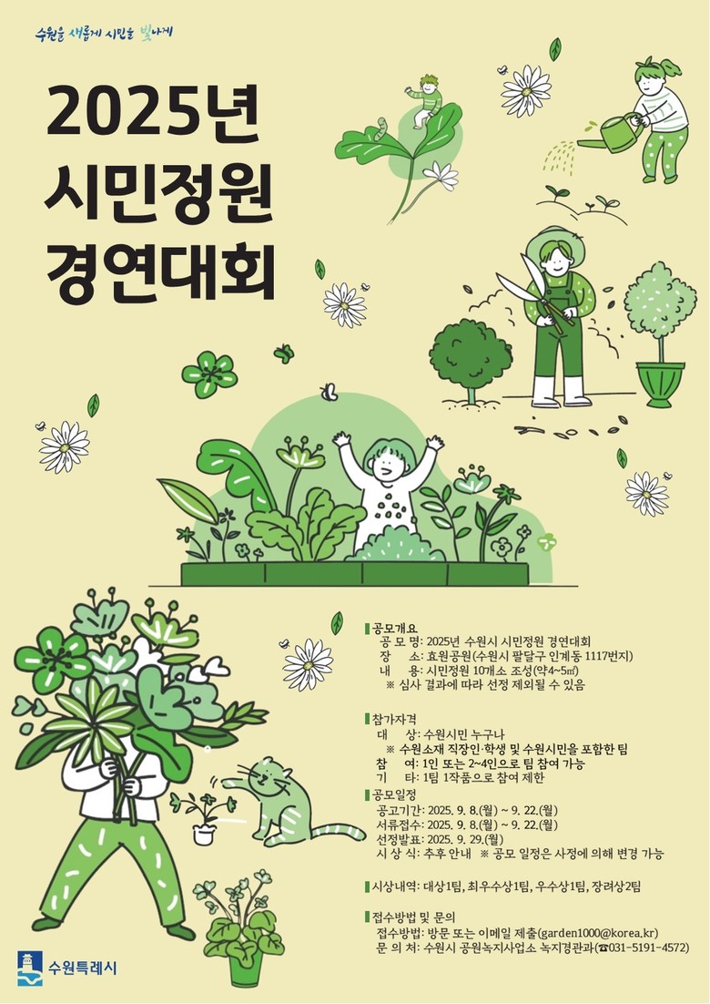 참가자들은 ‘흐르는 물결 속 피어나는 생명’을 주제로 작성한 정원 조성안, 참가신청서 등을 작성해 공원녹지사업소 1층 녹지경관과(방문)나 전자우편(garden1000@korea.kr)으로 제출하면 된다.