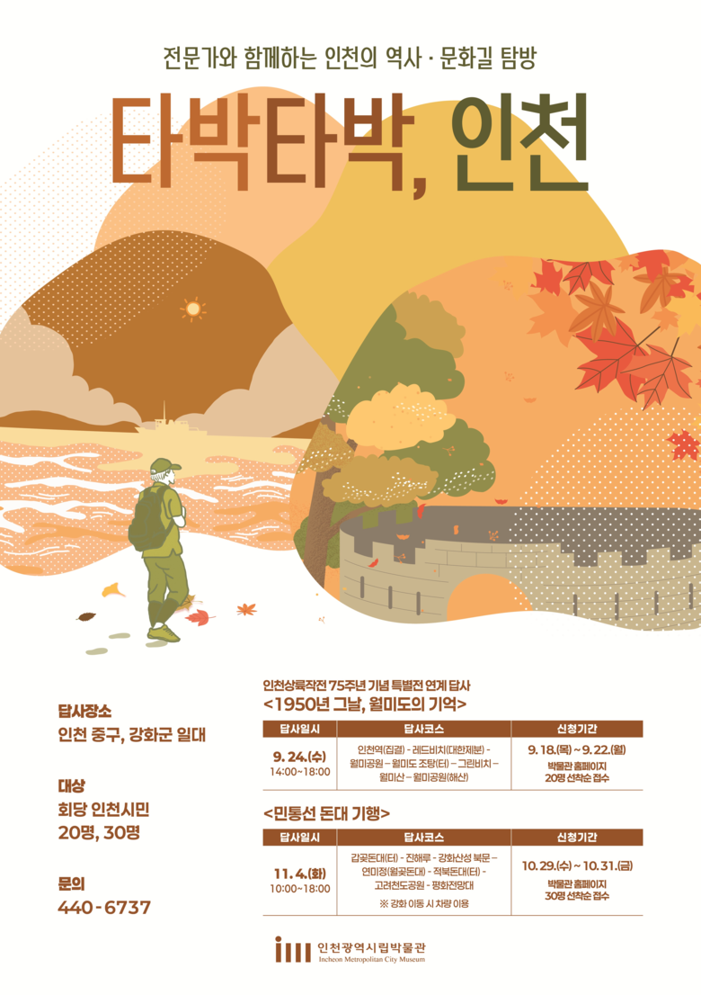 20세 이상 시민이면 누구나 참가할 수 있으며, 답사비는 무료다. 참가 신청은 9월 18일부터 인천시립박물관 누리집을 통해 가능하며, 선착순 20명을 모집한다.