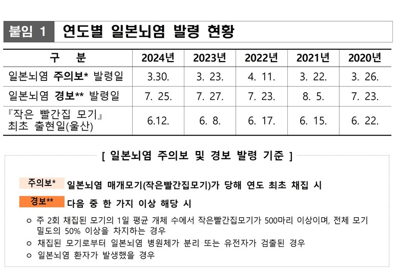 한편 질병관리청은 지난 3월 27일 제주와 전라남도 지역에서 올해 처음 일본뇌염 매개모기가 확인됨에 따라 ‘일본뇌염 주의보’를 발령한 바 있다.