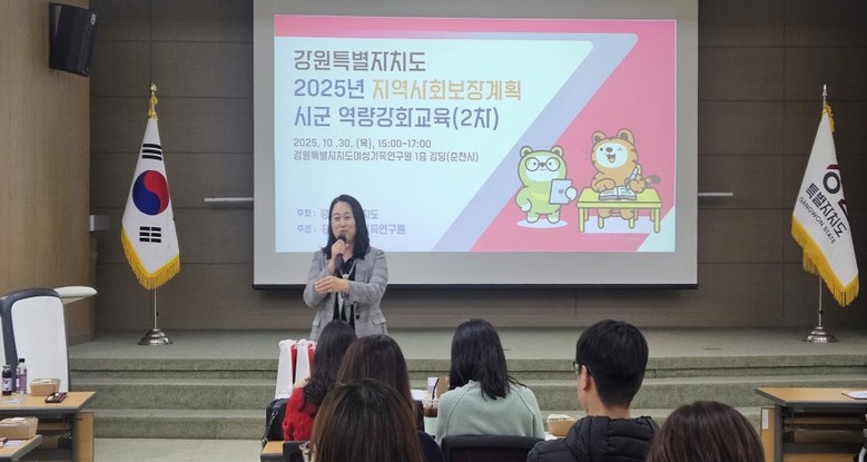 [강원도 세계타임즈=김민석 기자] 강원특별자치도 및 도 여성가족연구원(원장 김숙영) 복지균형지원센터는 10월 30일(목) 본원 강당에서 「2025년 지역사회보장계획 시군 역량강화교육(2차)」를 개최하였다.