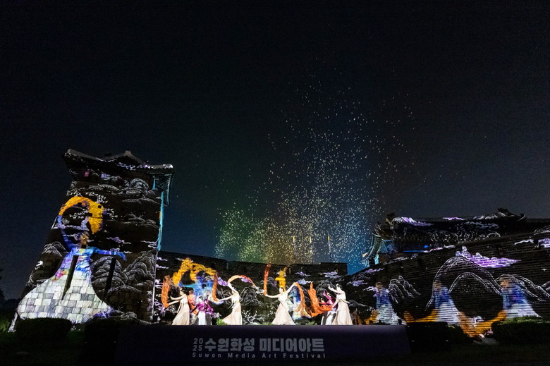 | ▲ 화서문 성벽에 2025 수원화성 미디어아트 메인 작품인 ‘새빛 향연’이 상영되고 있다. |