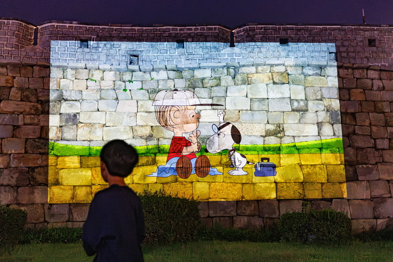 | ▲ 올해 미디어아트에서 피너츠사와 협업으로 수원화성 성벽에 스누피 캐릭터가 비춰지고 있다. |