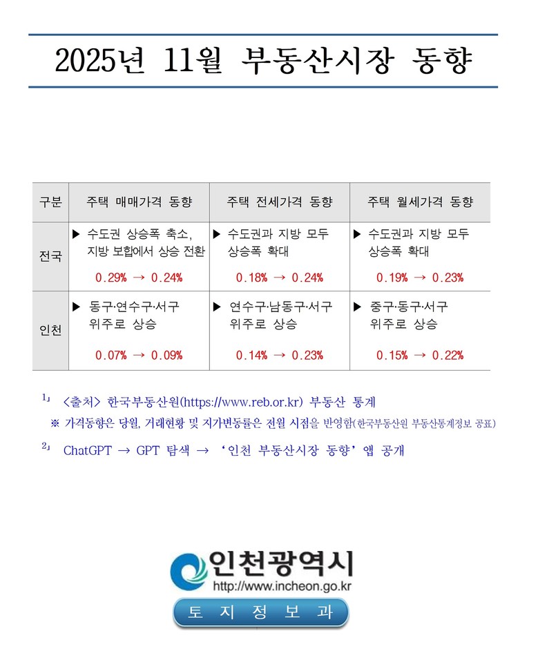 인천시가 한국부동산원의 부동산 통계정보를 분석한 ‘2025년 11월 부동산시장 동향 보고서’에 따르면, 11월 인천의 주택 매매가격지수 변동률은 전월 0.07%에서 0.09%로 상승폭이 확대됐다. 지역별로는 연수구(0.02%→%0.16), 동구(0.11%→0.14%), 서구(0.13%→0.10%), 남동구(0.03%→0.09%), 중구(0.05%→0.09%), 부평구(0.07%→0.07%), 계양구(0.05%→0.06%), 미추홀구(0.04%→0.05%) 순으로 상승했다.