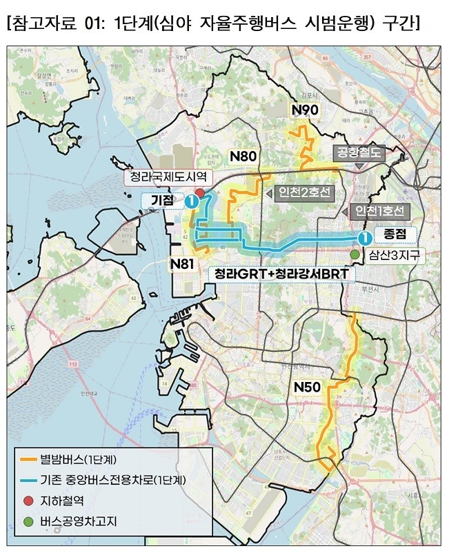 - 1단계(시범운행): 안전성 확보를 위해 기존 중앙버스전용차로(청라 GRT·BRT) 구간을 대상으로 심야 자율주행버스를 시범 운행
