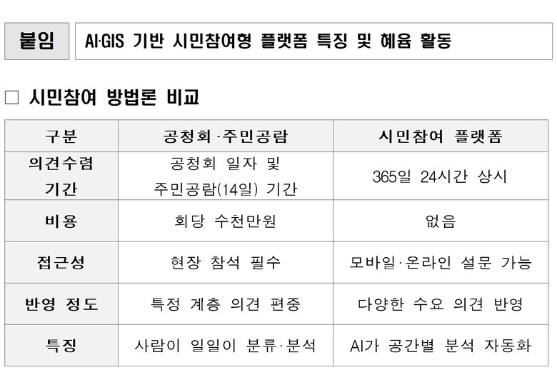 이 모델은 원도심·신도시·농어촌 등 지역별 특성을 반영한 맞춤형 생활권계획을 수립할 수 있도록 지원하며, 고비용·저효율의 공청회 중심 구조에서 벗어나 데이터 기반·인공지능(AI) 분석 중심의 과학적 행정을 가능하게 한다.