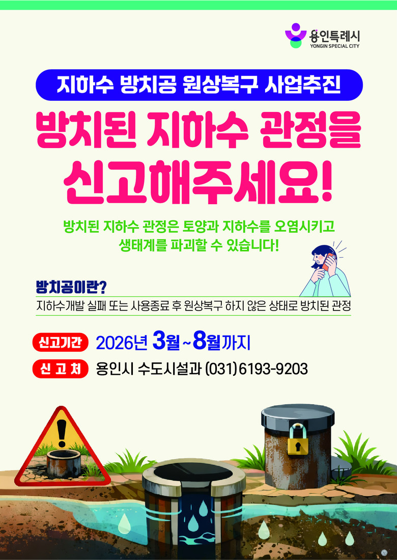 시 관계자는 “지하수는 시민 생활과 직결된 중요한 공공자원”이라며 “방치된 지하수 관정을 조기에 정비해 수질 오염과 안전사고를 예방하겠다”고 말했다.