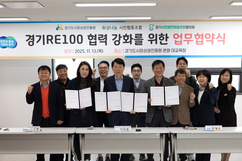 경기 양평군 경상원 본원에서 열린 협약식에는 경상원 김민철 원장, 화성나눔시민협동조합 이혜연 조합장, 경기시민발전협동조합협의회 안명균 회장 등 양 기관 주요 관계자들이 참석해 ‘경기 RE100’ 목표 달성을 위한 상호 협력 사항을 중점 논의했다.
