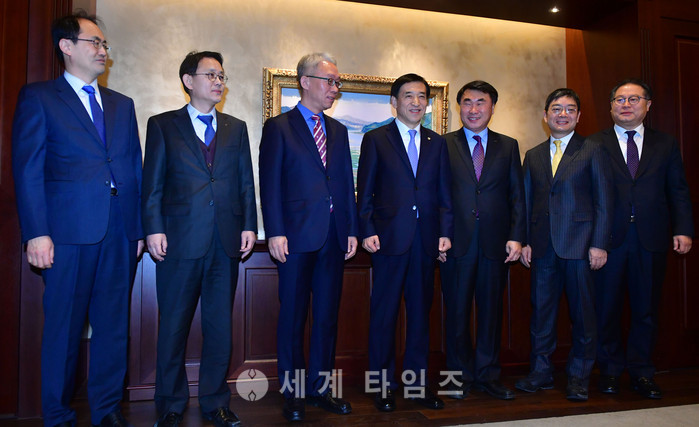 이주열(왼쪽 네번째) 한국은행 총재가 8일 오전 서울 중구 한국은행에서 열린 경제동향간담회에서 참석자들과 기념촬영을 하고 있다. 왼쪽부터 지만수 한국금융연구원 국제금융연구실 연구위원, 신승관 한국무역협회 국제무역연구원장, 이한영 중앙대학교 경제학부 교수, 이 총재, 조영수 대한무역투자진흥공사 시장동향분석실장, 정영록 서울대학교 국제대학원 교수, 이재영 대외경제정책연구원 구미유라시아본부장. 2017.02.08.