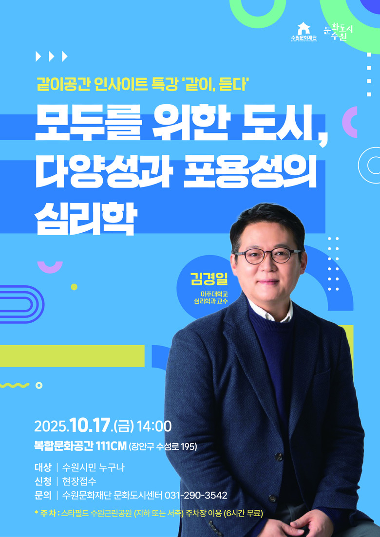 수원문화재단 관계자는 “이번 프로그램이 문화도시 수원의 비전인 ‘서로를 살피고 문제에 맞서는 도시’를 실현하는 의미 있는 실천의 장이 되기를 바란다.”며, “특강으로는 우리 사회의 지향점을 고민해 보고, 부모집단상담으로는 양육의 어려움을 나누며 실질적 해법을 얻는 기회가 되기를 기대한다.”고 말했다.