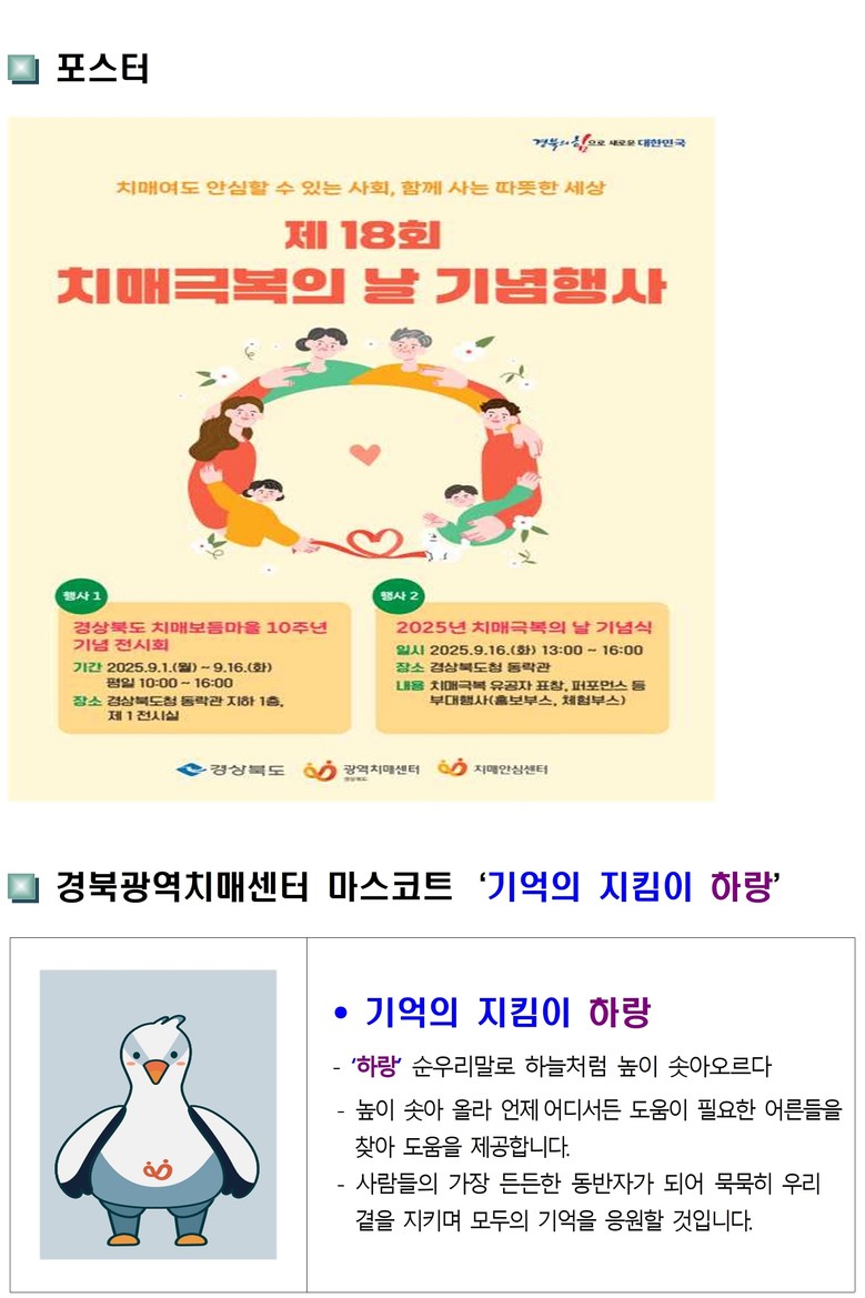 또한, 이번 전시회에는 경상북도광역치매센터 마스코트 ‘기억지킴이 하랑이’를 선보인다. ‘하랑’은 순우리말로 ‘하늘처럼 높이 솟아오르다’라는 뜻으로 높이 솟아올라 언제 어디서든 도움이 필요한 어른을 찾아 도움을 제공하겠다는 의지를 품고 있다.