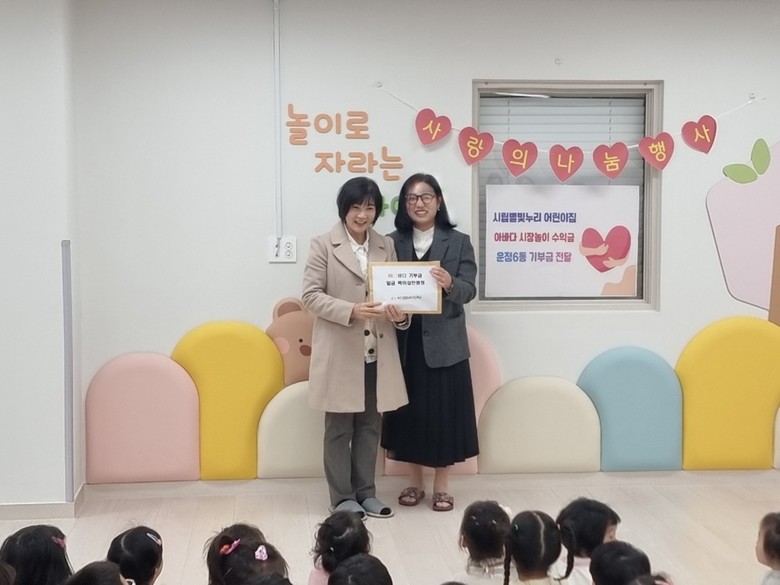 이번에 전달된 성금은 지난해 12월 성탄절을 맞아 원아들이 기부한 의류, 신발, 장난감과 어린이집에서 마련한 음식을 판매한 바자회 수익금으로 마련됐다.