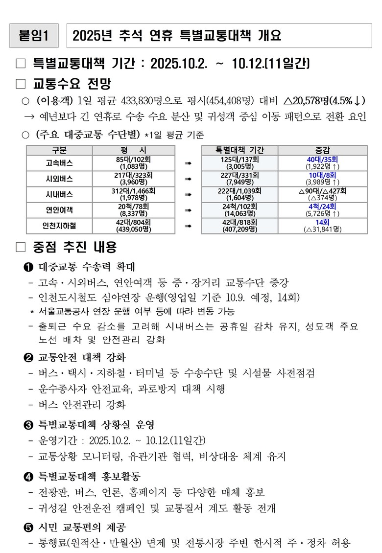 [인천 세계타임즈=심하린 기자] 인천광역시(시장 유정복)는 추석 연휴 동안 시민들이 안심하고 이동할 수 있도록 오는 10월 2일부터 12일까지 11일간을 ‘추석 특별수송기간’으로 정하고, ‘2025년 추석 연휴 특별교통대책’을 시행한다고 밝혔다.