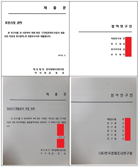 최춘식의원실의 자료에 따르면, ‘대장동 개발사업 용역’과 ‘포천도시공사 설립 용역’은 실무자(김모씨 2명)까지 같았다. 두 개의 용역 모두 한국경제조사연구원 총괄본부장인 성모씨의 주도 아래 추진됐다.