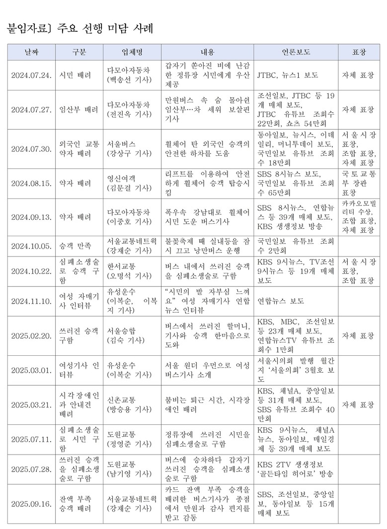 서울특별시버스운송사업조합 홈페이지 ‘칭찬합시다’ 게시판을 통해 승객과 시민들이 직접 올린 선행사례를 보면 ▲2023년 530건 ▲2024년 778건 ▲2025년(10월 기준) 904건으로, 최근 3년간 총 2,212건에 달한다. 이는 시민의 안전과 불편 해소를 위해 묵묵히 헌신하는 버스운수종사자들의 노력이 점차 사회적 공감을 얻고 있음을 보여준다.