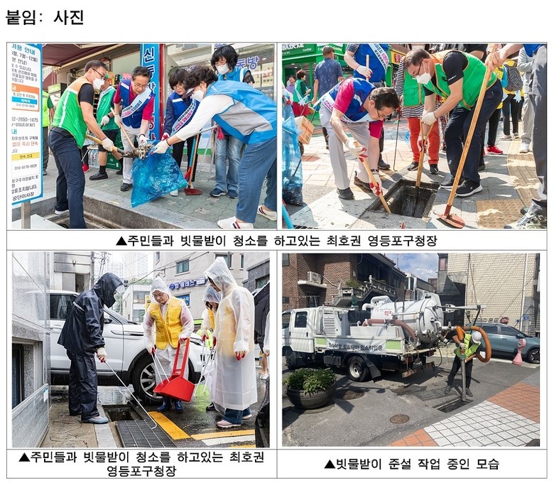 최호권 영등포구청장은 “최근 기후변화로 집중호우가 잦아지는 만큼 사전 대비가 무엇보다 중요하다”라며 “철저한 배수 시설 관리와 신속한 대응 체계를 통해 구민의 생명과 재산을 지키는 데 최선을 다하겠다”라고 전했다.