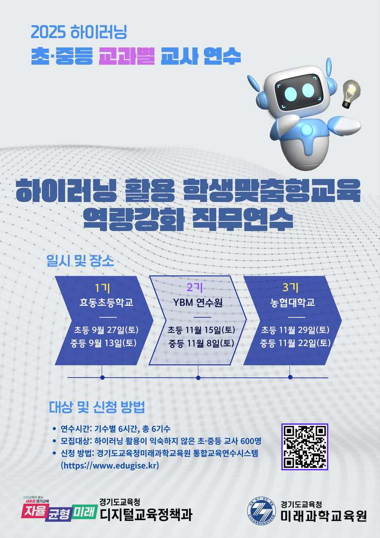 박정행 경기도교육청미래과학교육원장은 “이번 연수가 교사의 교수·학습 설계에 대한 전문성을 높여내는 것은 물론 학생의 맞춤형 성장 지원에도 기여할 것”이라고 말했다.