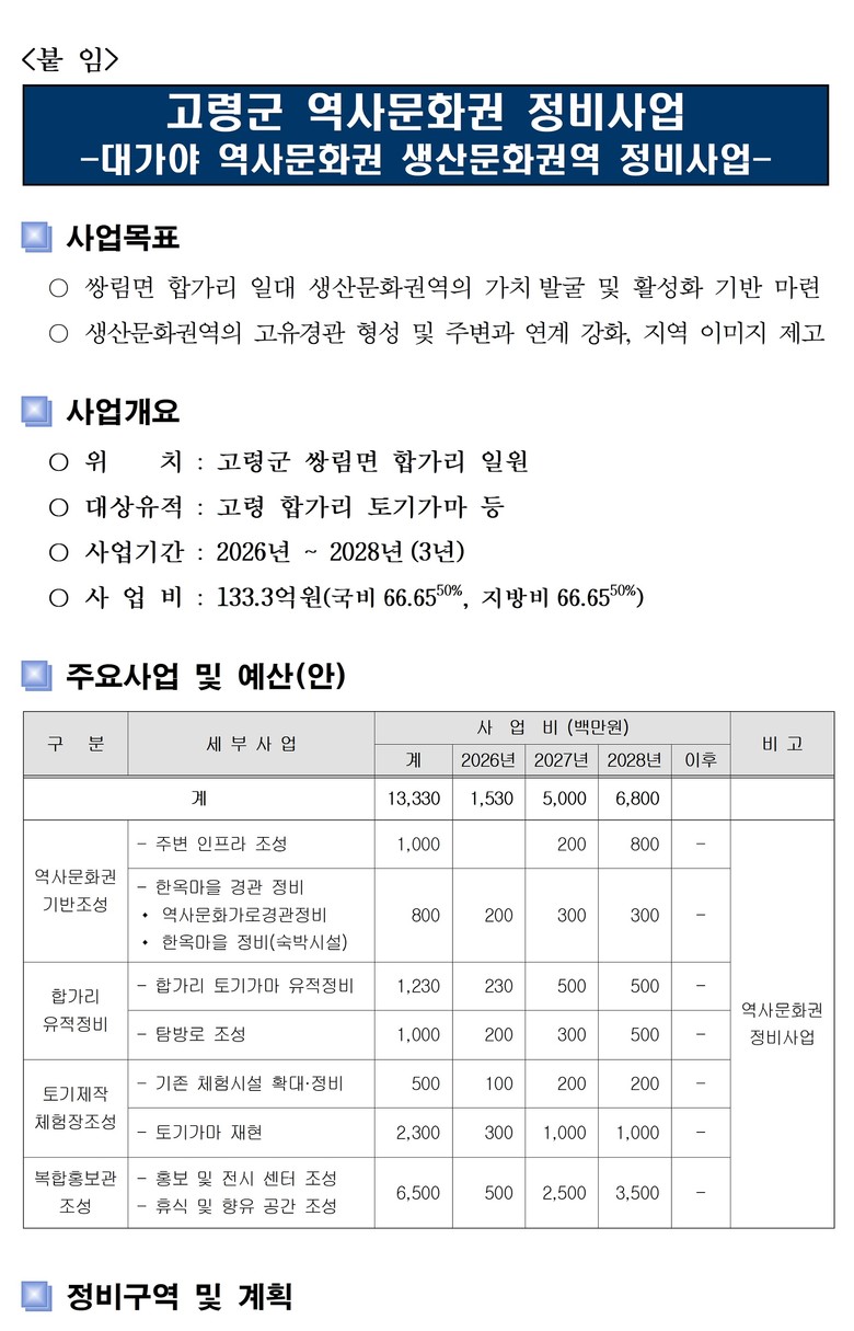 고령군 대가야 생산문화권역 정비사업은 2026년에서 2028년까지 3년간 총사업비 133억원(국비 66.5, 지방비 66.5)을 투입해 쌍림면 합가리 일원의 대가야 토기 가마 유적을 발굴·정비하고 대가야 생산문화권역의 가치 발굴과 지역 활성화 기반을 마련한다.