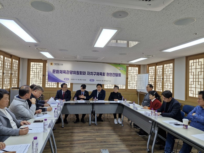[서울 세계타임즈=이장성 기자] 서울특별시의회 문화체육관광위원회 이종배 위원장 직무대리(국민의힘, 비례대표)를 비롯한 위원들은 지난 11월18일(화) 지역 체육 현안 해결을 위해 자치구 체육단체장들과 머리를 맞대며 현장의 목소리를 직접 듣는 간담회를 개최하였다.