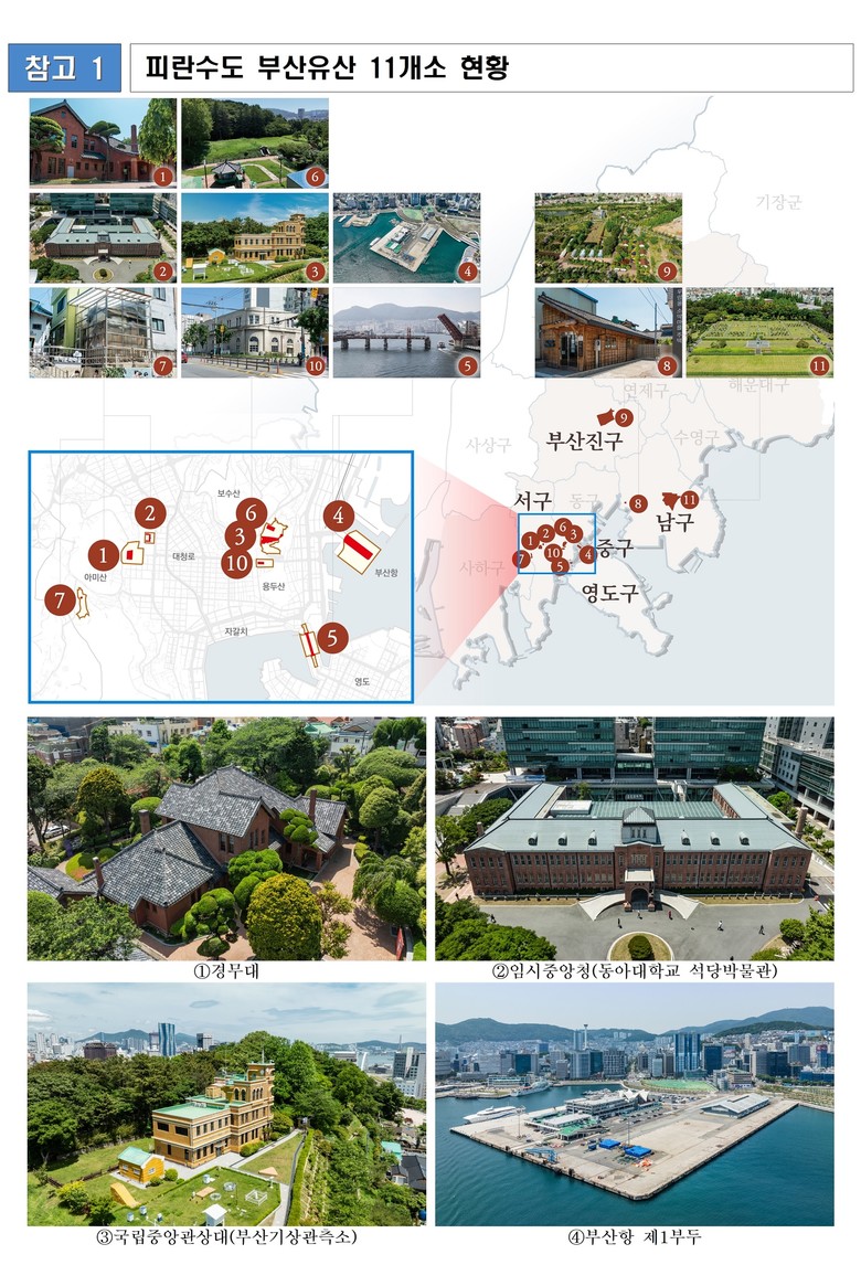 * 구성유산 11곳: ▲[기존 9곳] ①경무대(임시수도대통령관저), ②임시중앙청(동아대학교 석당박물관), ③아미동 비석 피란주거지, ④국립중앙관상대(부산기상관측소), ⑤미국대사관 겸 미국공보원(부산근현대역사관 별관), ⑥부산항 제1부두, ⑦하야리아기지(부산시민공원), ⑧유엔묘지(부산재한유엔기념공원), ⑨우암동 소막 피란주거지 ▲[추가 2곳] ⑩영도다리(영도대교), ⑪복병산배수지