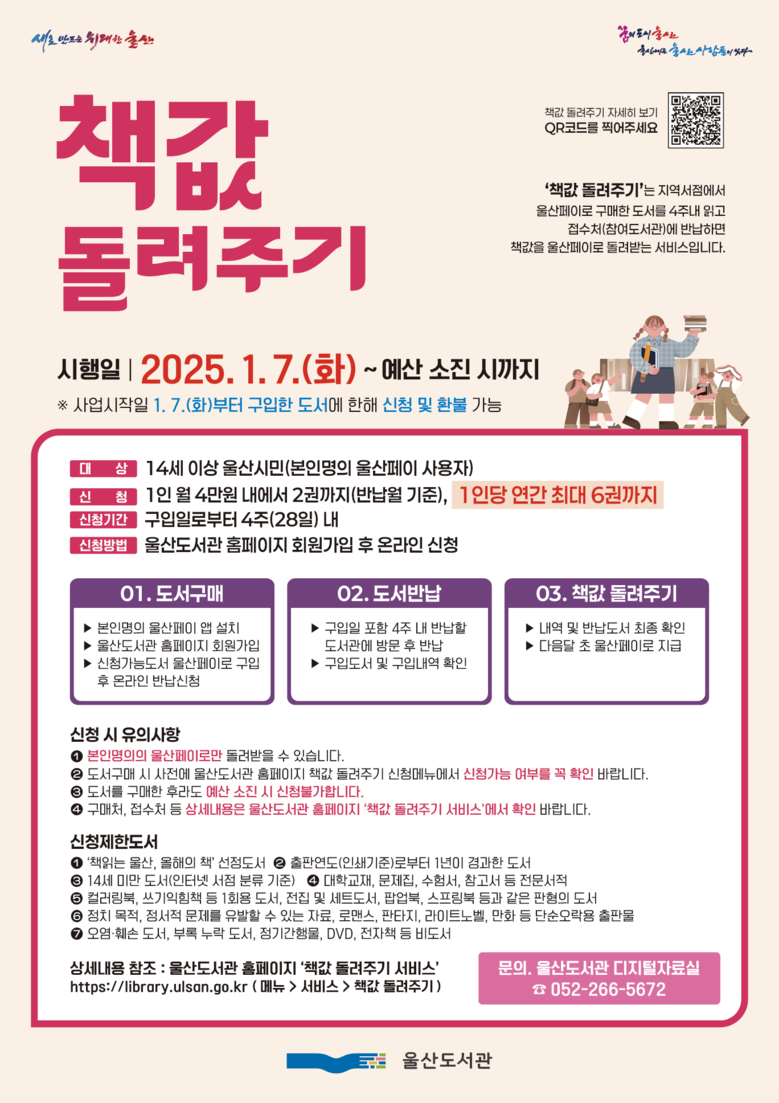 울산도서관 관계자는 “올해로 6년 연속 추진 중인 책값 돌려주기 사업이 해마다 시민들의 높은 호응과 공공도서관의 적극적인 협조로 독서문화 분위기 조성에 큰 도움이 되고 있다”라며 “2025년에는 1인당 연간 최대 6권까지 신청할 수 있도록 변경하면서 더 많은 시민들이 책을 구매해 읽을 수 있는 기회를 제공하는 만큼 앞으로도 많은 참여를 부탁드린다”라고 말했다.