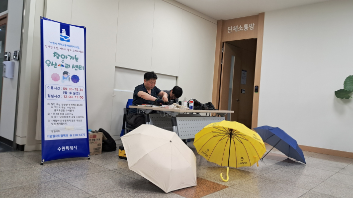 3월 장안구민회관(장안구)을 시작으로 4월 농수산물도매시장(권선구), 5월 영통구청(영통구), 6월 수원시가족여성회관(팔달구)을 순회하며 우산 수리센터를 운영했다. 매주 월~수요일(공휴일 휴무) 오전 9시부터 오후 4시까지 운영했고, 한 사람당 2개까지 수리할 수 있었다.