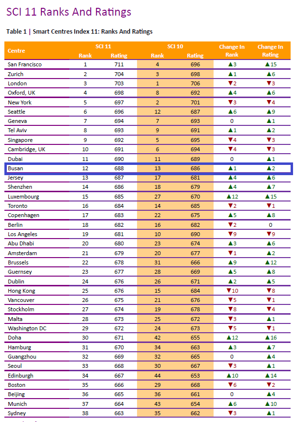 부산은 4년 전 평가에서 처음으로 순위에 든 이후 지속해서 순위가 상승 중이다. 이번 11회차 평가에서 12위에 이름을 올린 것은, 지난 회차 평가에 이어 세계 상위(글로벌 TOP) 순위에 다섯 번 연속 든 것으로 부산이 세계적인 지능형(글로벌 스마트)도시로 확고히 자리매김했음을 보여준다.