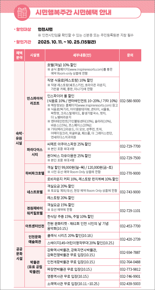 또한, 시민임을 확인할 수 있는 신분증 또는 주민등록등본을 지참하면 행사에 참여한 관내 숙박·유원시설·공공문화시설 등에서 특별 할인 혜택도 받을 수 있다. 자세한 사항은 인천시 누리집에서 확인 가능하다.