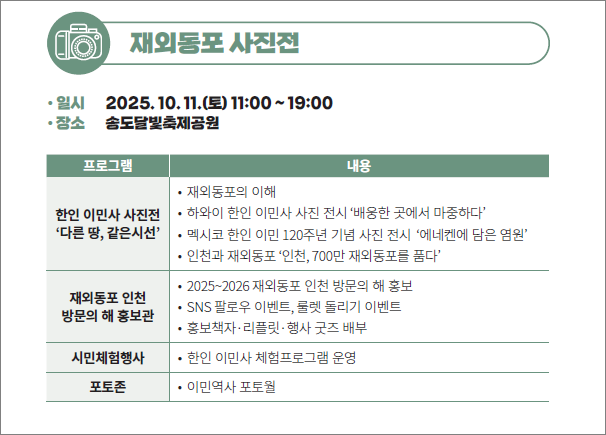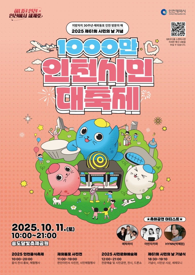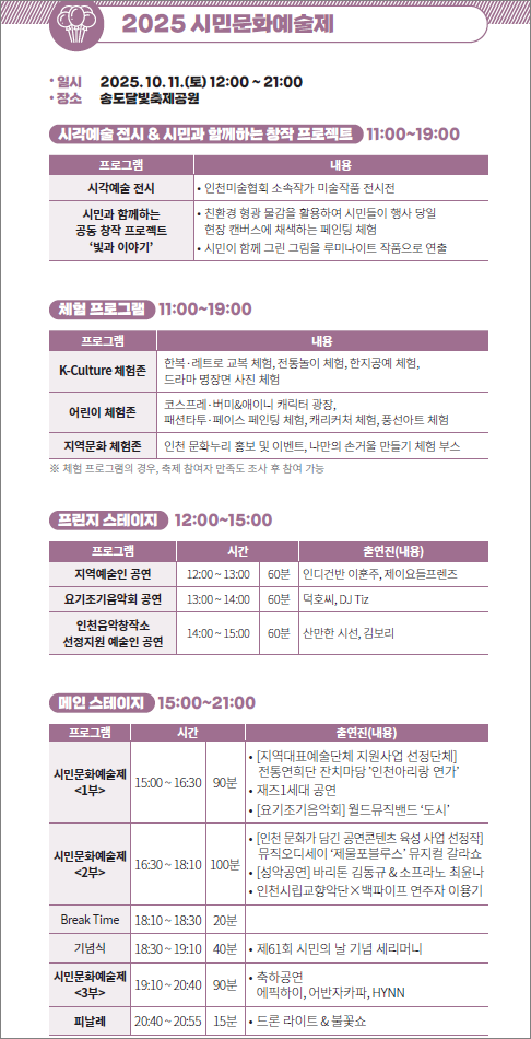 재외동포협력과가 주관하는 ‘재외동포 사진전’은 오전 11시부터 저녁 7시까지 열려 인천과 세계를 잇는 정체성을 조명한다. 예술정책과 주관의 ‘2025 시민문화예술제’는 낮 12시부터 밤 9시까지 3부로 진행되며, 에픽하이·어반자카파·HYNN(박혜원) 등이 무대에 올라 풍성한 공연을 선사한다.
