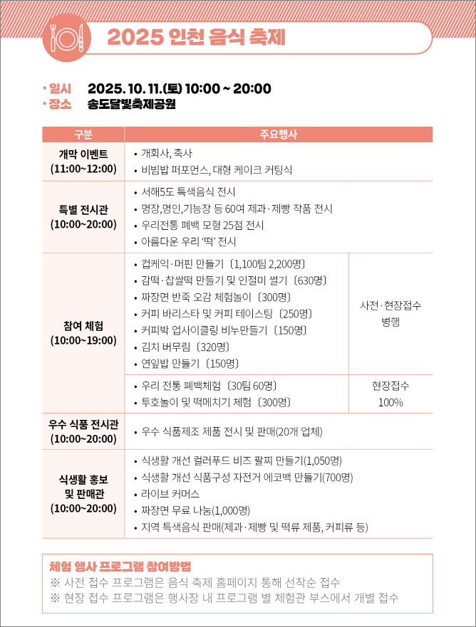 10월 11일 주요 행사로는 위생정책과 주관의 ‘2025 인천 음식 축제’가 대형 비빔밥 퍼포먼스와 케이크 커팅식으로 개막 분위기를 띄우며 다채로운 음식 콘텐츠를 선보인다.