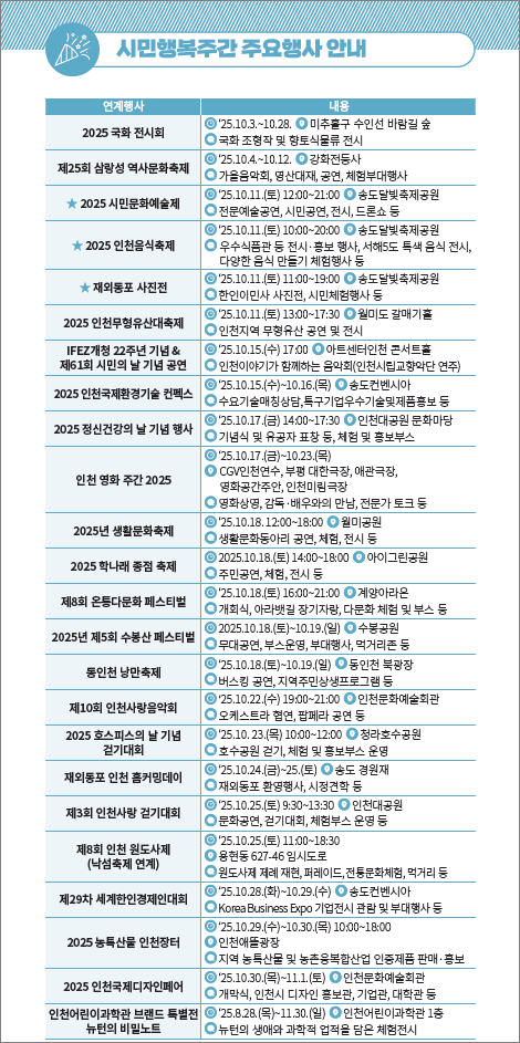 시는 10월 11일부터 25일까지 2주간을 ‘시민행복주간’을 운영한다. 이 기간 동안 국화전시회, 인천 영화주간, 재외동포 인천 홈커밍데이, 농특산물 인천장터 등 24개의 문화·예술·관광·체육·전시 연계행사가 인천 전역에서 펼쳐진다.