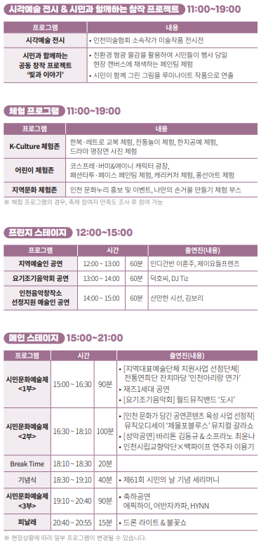 ‘2025 시민문화예술제’는 시민 누구나 참여할 수 있는 무료 축제로, 자세한 내용은 누리집(https://incheonfestival.co.kr/)을 통해 확인할 수 있다.