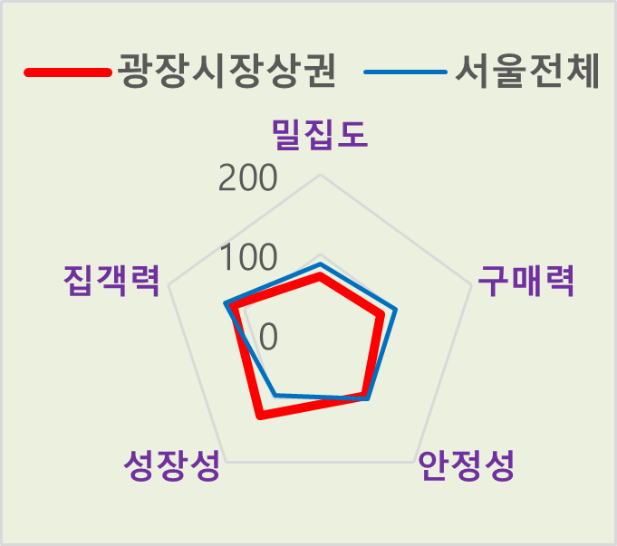 광장시장 상권에 대한 평가 항목 중 대부분은 서울 상권 평균 대비 낮은 점수를 기록했다. 하지만 미래의 소비 큰손인 MZ고객 방문 증가가 상권 활성화에 기여하고 있는 등 성장성에서 높은 점수를 받아 1등급 상권으로 선정됐다.(상단 그림 1.참고)