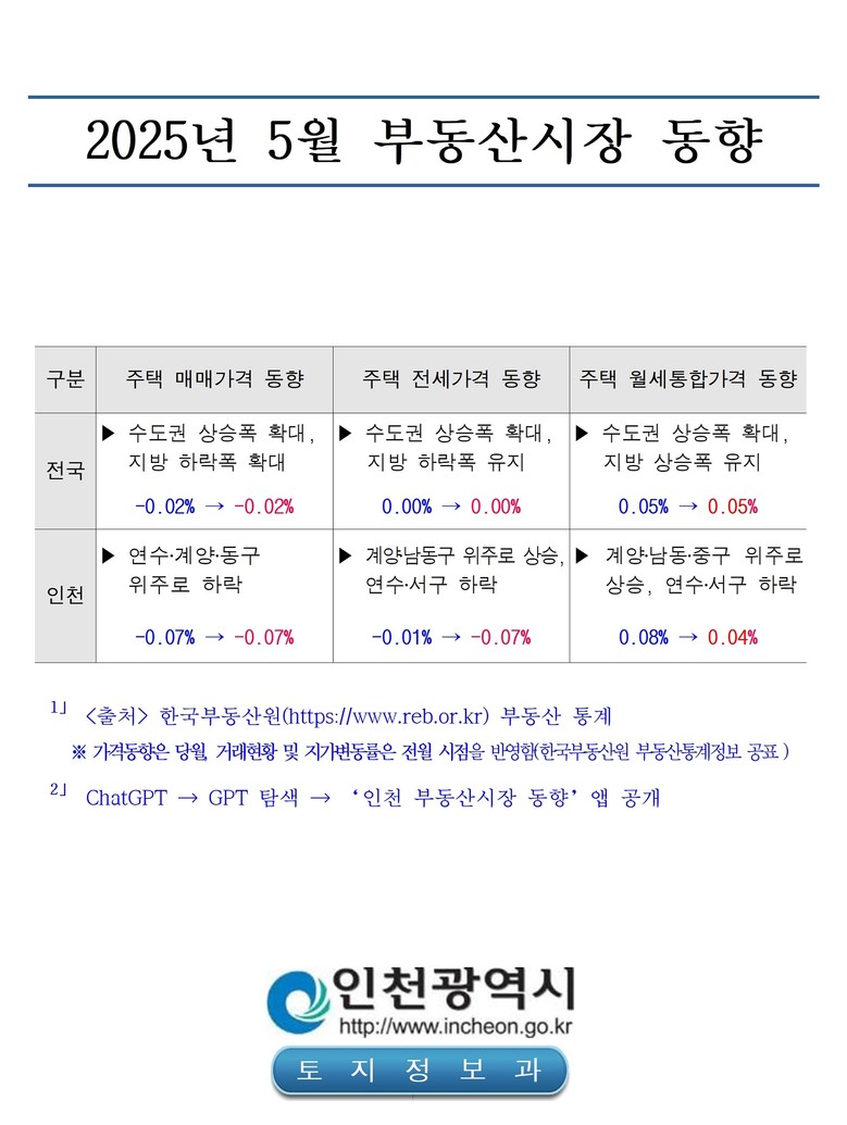 - 부동산시장 동향 및 아파트 실거래가→ ChatGPT 공개 - [인천 세계타임즈=심하린 기자] 인천광역시(시장 유정복)는 2025년 5월 주택 매매가격이 전월과 동일한 수준으로 하락했다고 밝혔다.