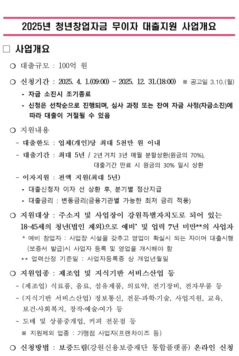 [강원도 세계타임즈=김민석 기자] 강원특별자치도(도지사 김진태, 이하 ‘도’)는 글로벌 경제 불확실성 증가와 내수 부진으로 인한 경기 침체 속에서, 청년 사업자의 경영 애로를 해소하고 창업을 희망하는 청년들에게 자금을 지원하여 자립과 성장을 돕기 위해 ‘2025년 청년 창업자금 무이자 대출 지원사업’을 시행한다.