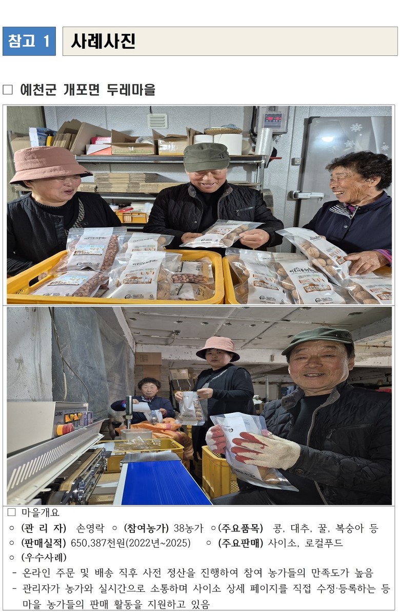 대표적인 사례로 예천군 개포면 ‘두레마을’은 서울에서 귀농한 관리자의 전문성을 바탕으로 38개 농가가 참여하는 공동체로 구성되었으며, 관리자는 온라인 쇼핑몰 ‘사이소’의 상품 상세 페이지를 직접 운영하고 실시간 고객 소통과 신속한 정산을 지원해 참여 농가의 만족도를 높였다.